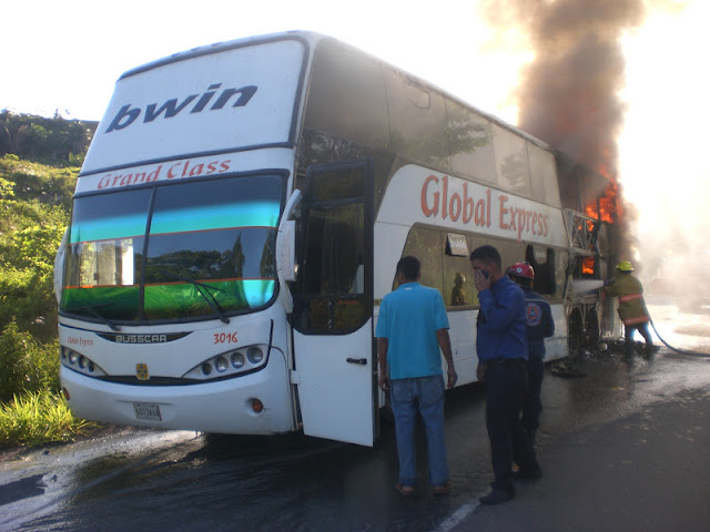 Una unidad BUSSCAR de color blanco de esta empresa, se estaba quemando esta tarde por el motor en VEGA DE AZS, Troncal 5. Lo acabao de ver en la p\'agina WEB del Diario La Naci\'on de San Crist\'obal. Sale la foto pero no se le ve el n\'umero.